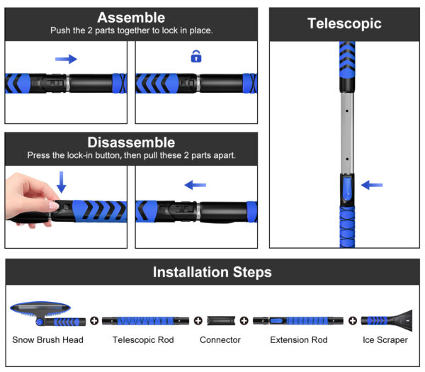 【Easy to Disassemble】This snow removal set includes a snow brush, an ice scraper, a telescopic pole, an extension pole, and a non-woven storage bag. It is a powerful all-in-one snow removal solution that can be easily stored in your car or home. With a detachable design, it can be easily disassembled and assembled, and enjoy a neat and organized winter trip!