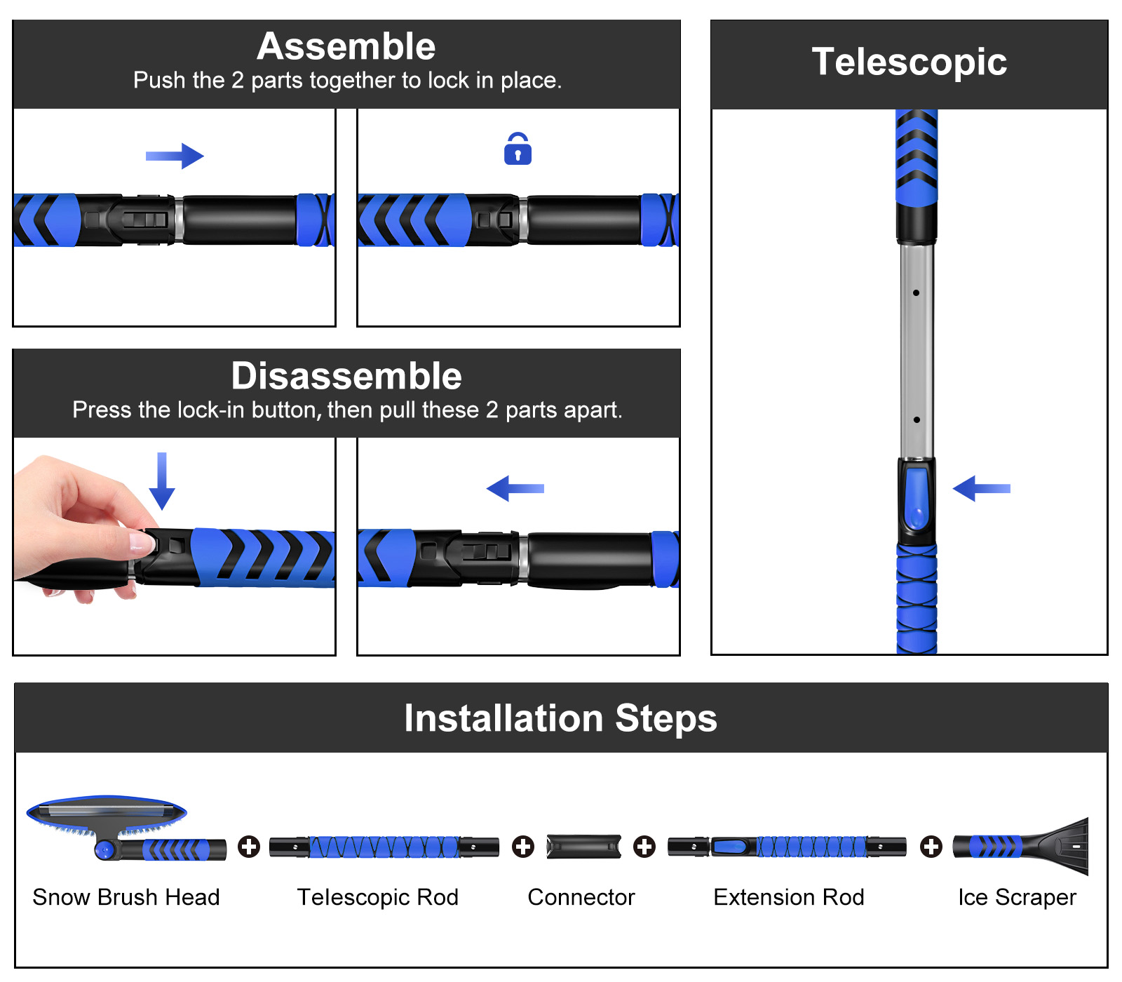 【Extendable Handle & Extension Pole】This snow removal kit’s sleek, multi-position aluminum handle extends from 50″ to 60″ with the extension pole, making it easy to reach your windshield or roof. Adjust the length to your needs to ensure efficient snow and ice removal without any effort. Suitable for any vehicle, whether it’s a sedan, SUV, van, or truck, you can get deep snow removal to cover any area.